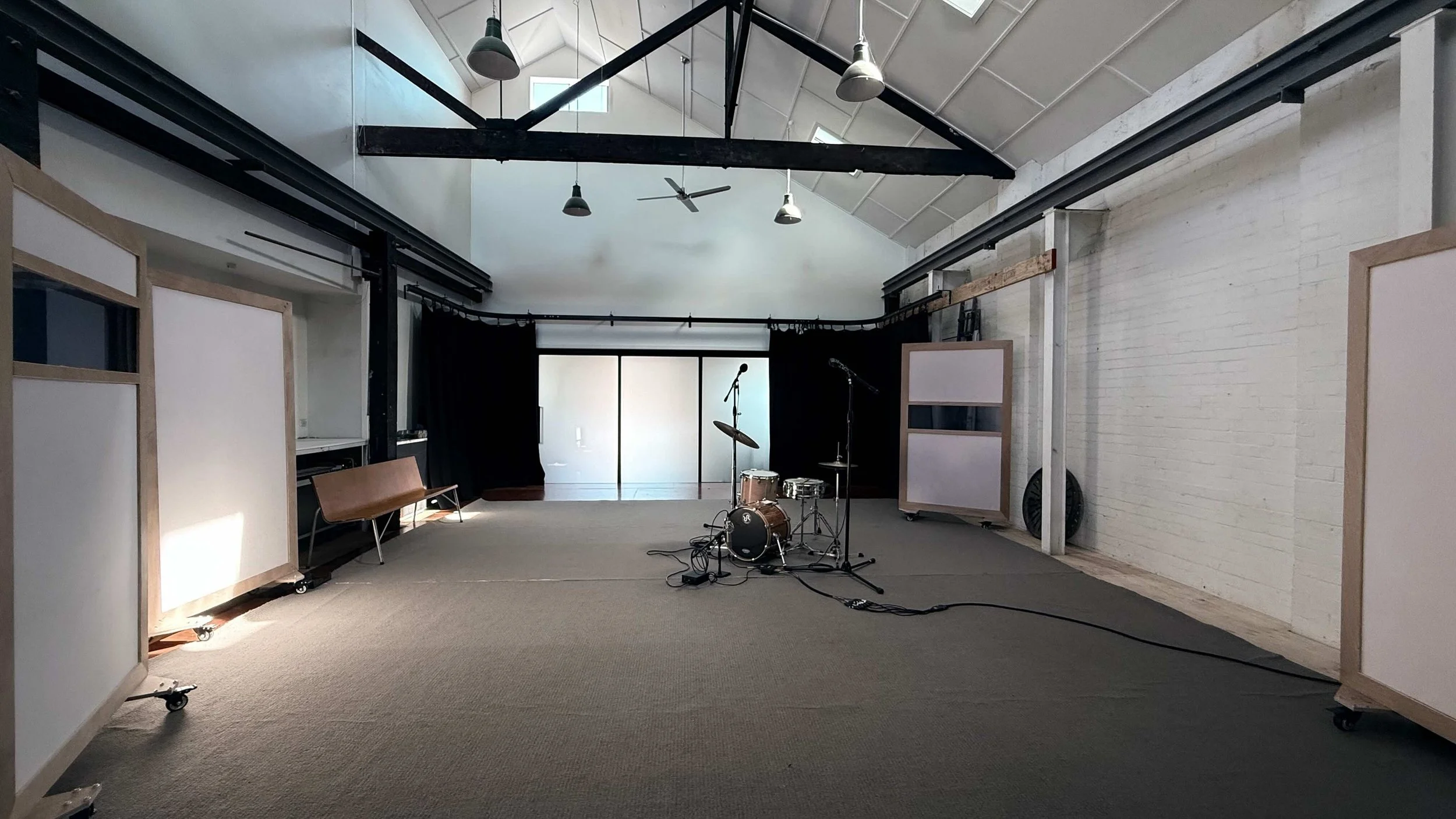 Florence Street Studios can be optimised for either sound or dance/theatre. The wooden floor 'floats' on rubber stoppers but can be covered with carpet to deaden the sound response. There are also 4 large moveable audio 'gobos' to provide sound isolation.